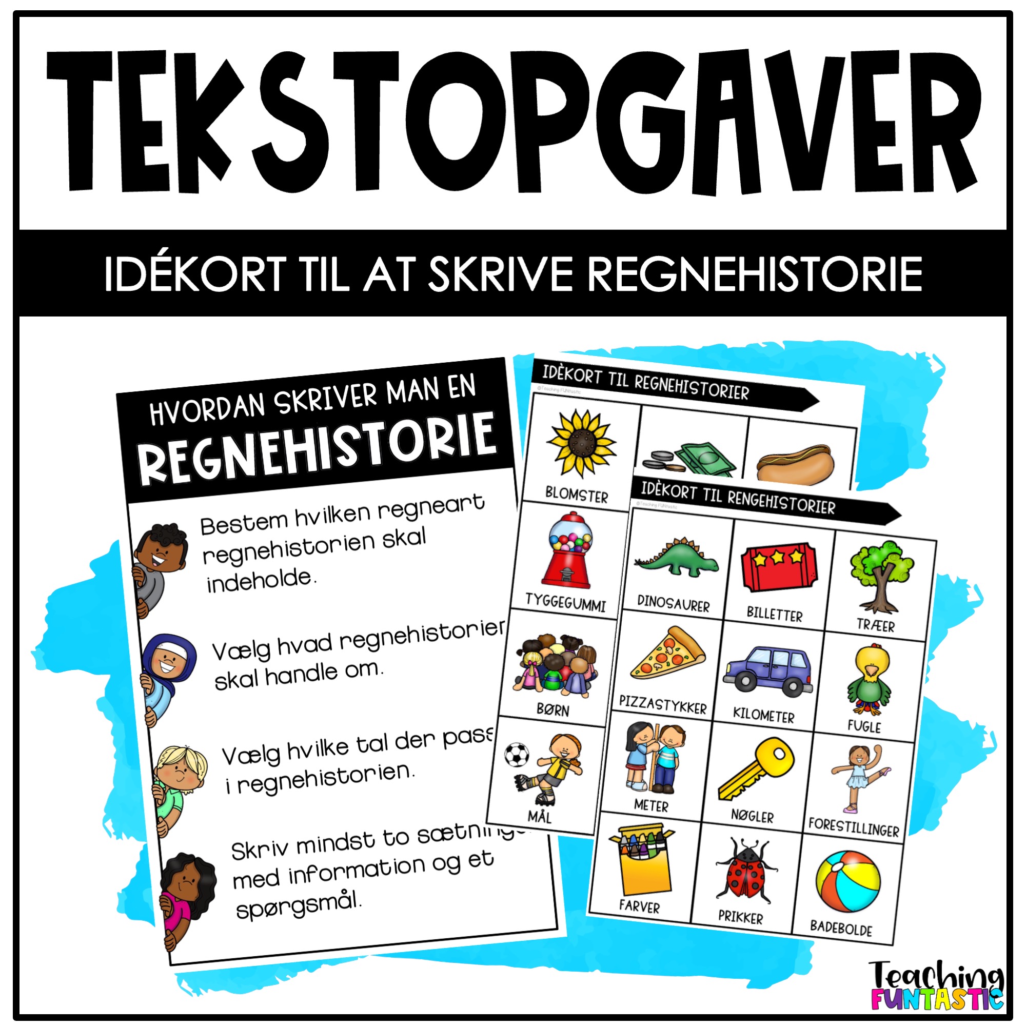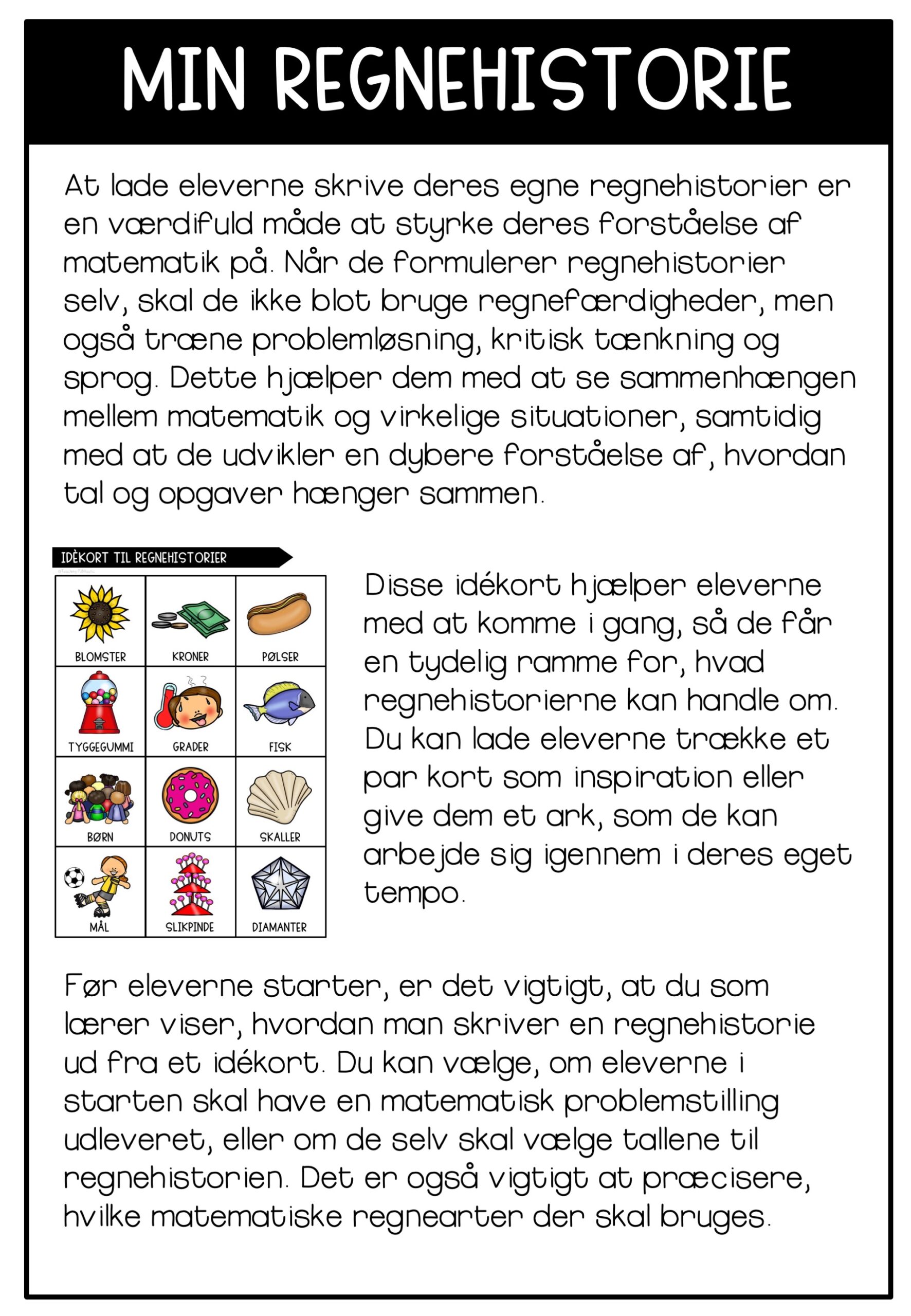 De medfølgende idékort hjælper eleverne i gang og giver dem en tydelig ramme for, hvad deres regnehistorie kan handle om. Du kan lade eleverne trække et eller to kort for inspiration – eller give dem et helt kortsæt, som de arbejder med i deres eget tempo.