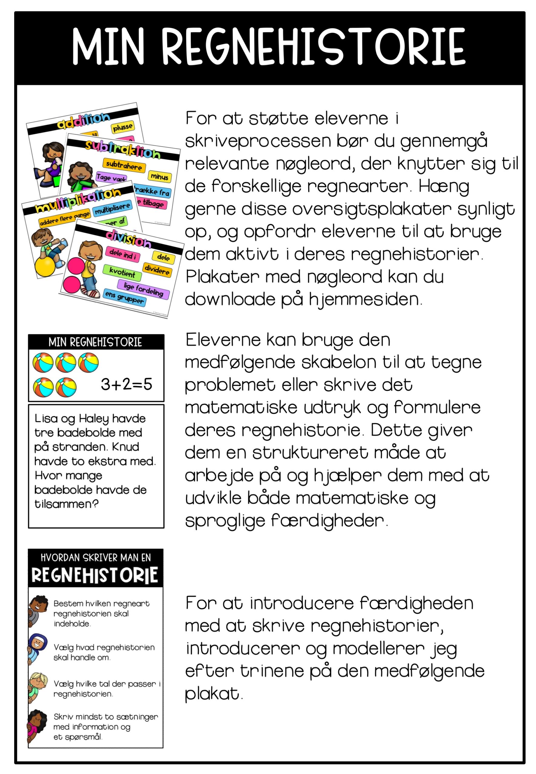 Eleverne kan bruge den medfølgende skabelon til at tegne problemet, skrive regneudtrykket og formulere deres regnehistorie. Denne struktur hjælper dem med at udvikle både matematiske og sproglige færdigheder på en overskuelig måde.