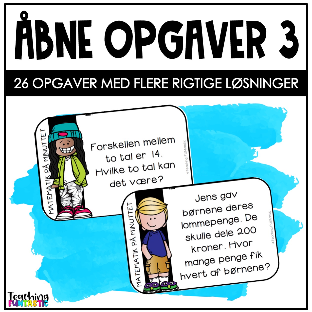 Dette sæt består af 26 åbne opgaver i matematik. Åbne opgaver giver mulighed for flere rigtige løsninger og brug af flere strategier og tænkemåder. Eleverne får mulighed for at forklare hvordan de tænker og se flere måder at løse opgaver på. Læreren får gennem en «matematik-snak» godt indblik i hvordan eleverne tænker og løser opgaver. Åbne opgaver i matematik giver rum for differentiering, hvor eleverne kan løse opgaven ud fra sit eget niveau.