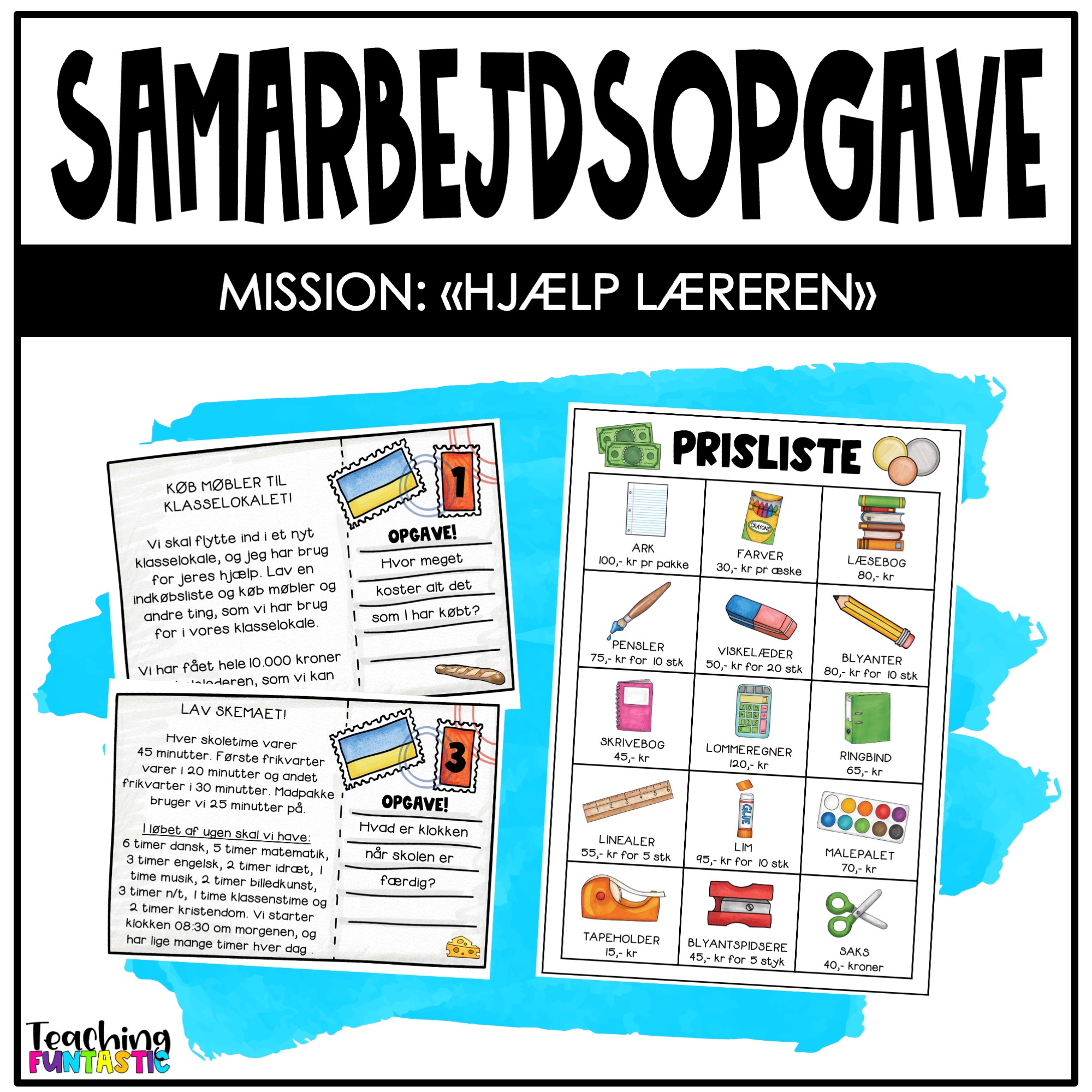 Pakken Mission: Hjelp læreren er en samarbejdsopgave til skolestart, lavet til eleverne på 2.-4. årgang. Den giver eleverne god træning i at samarbejde og tænke både logisk og kritisk. Læreren er rejst på ferie og sidder nu fast i udlandet uden mulighed for at komme hjem i tide til at planlægge skolestart. Han/hun har sendt et postkort til sine elever og beder dem om at hjælpe ham/hende med flere opgaver. Eleverne skal arbejde i mindre grupper og arbejde sammen om at løse opgaverne. Hver opgave er placeres i en konvolut, og selve opgavekortene limes på forsiden af konvolutten. Opgaverne er nummeret fra 1-6, men det er ikke nødvendigt at løse opgaverne i den rigtige rækkefølge. Nogle af opgaverne har åbne løsninger, men andre har fast løsninger, hvor alle grupper får det samme svar. Løsningsbesvarelsen findes i vejledningerne for hver opgave.