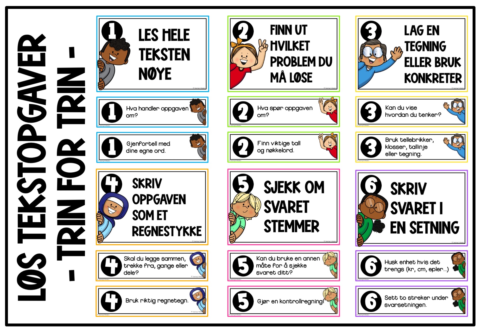 Disse farverige plakater hjælper indskolingselever med at forstå og løse tekstopgaver i matematik – ét trin ad gangen. Plakaterne viser seks enkle trin, som guider eleverne til at læse grundigt, finde ud af hvad opgaven handler om, vælge den rigtige regneart og vise, hvordan de tænker.