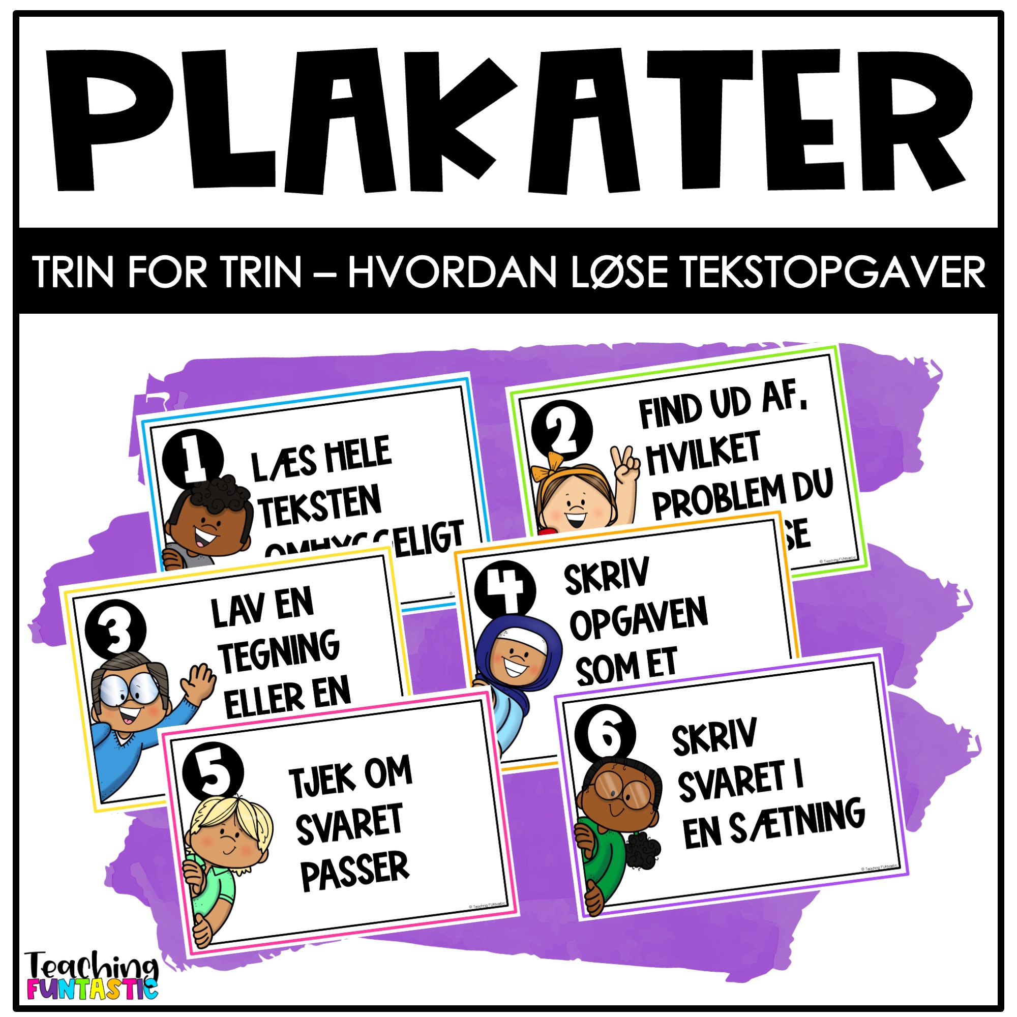 Plakaterne egner sig godt til brug på tavlen, i stationstræning eller som støtte ved elevens arbejdsplads. De giver tryghed og struktur og gør det lettere for eleverne at arbejde selvstændigt med tekstopgaver i matematik.